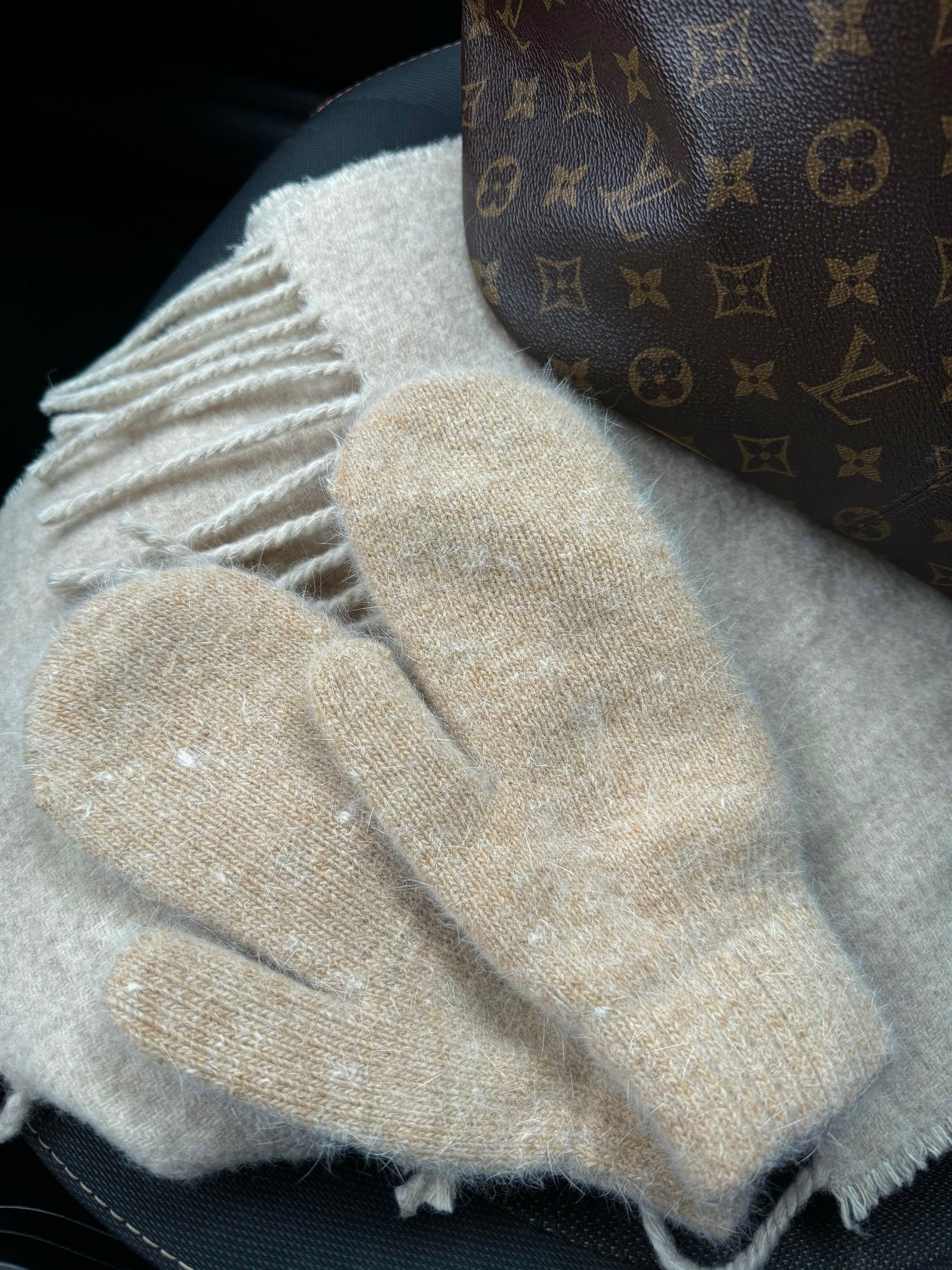 Keep your hands warm this winter with these thick knitted mittens, that are partly made out of Cashmere. Perfect to pair with your ‘everyday outfits’🤍.